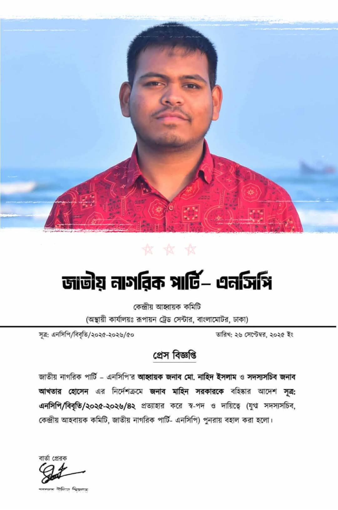 বহিষ্কারাদেশ প্রত্যাহার, নিজ দলে ফিরলেন ,জাতীয় নাগরিক পার্টির কেন্দ্রীয় যুগ্ন সদস্য সচিব মাহিন সরকার –