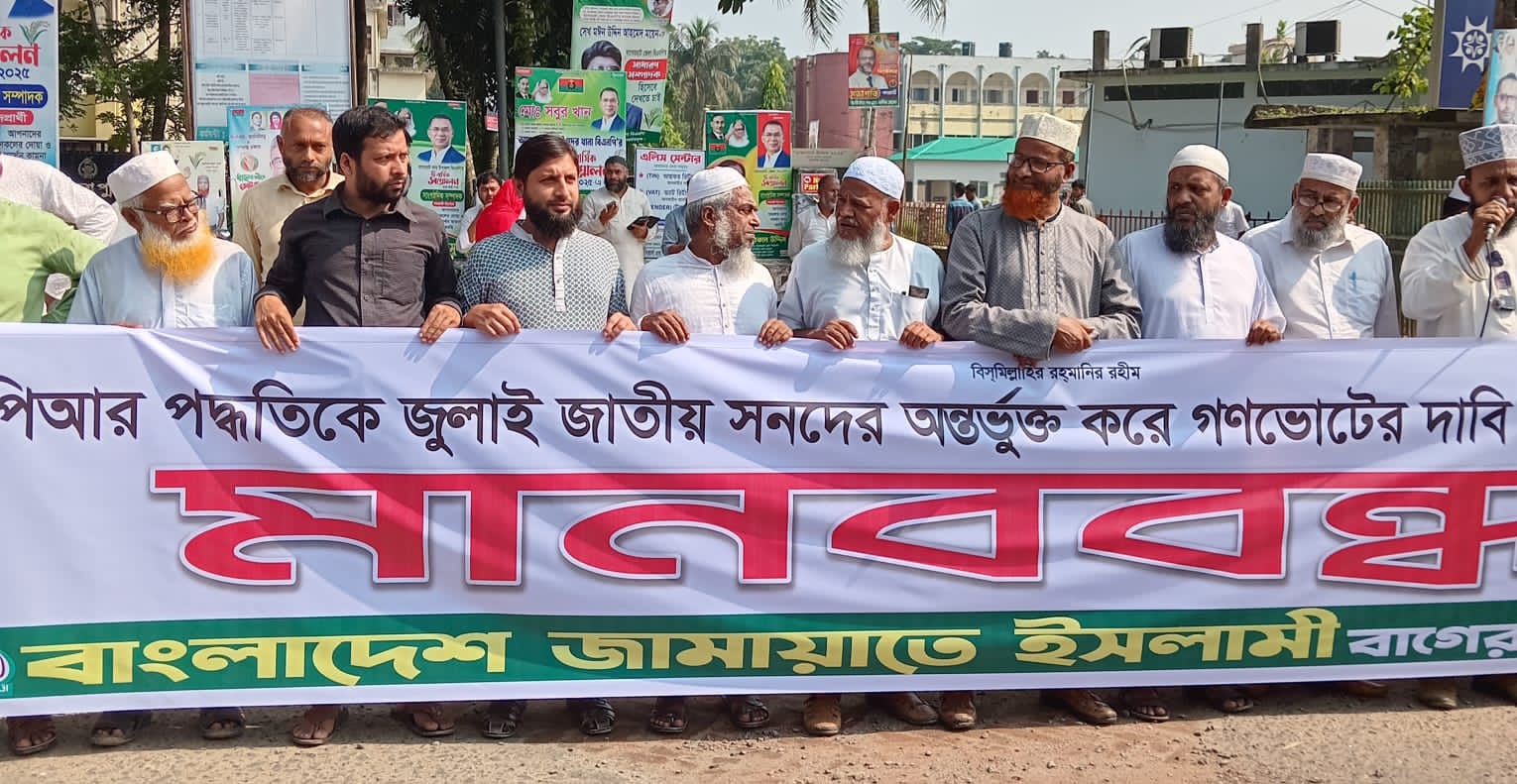 মোঃ ইকরামুল হক রাজিব বিশেষ প্রতিনিধি পিআর পদ্ধতিকে জুলাই জাতীয় সনদের অন্তর্ভুক্ত করে গণভোটের দাবি সহ ০৫ দফা দাবিতে মানববন্ধন করেছে বাংলাদেশ জামায়াতে ইসলামী বাগেরহাট জেলা শাখা। বুধবার (১৫ অক্টোবর) ...বিস্তারিত পড়ুন